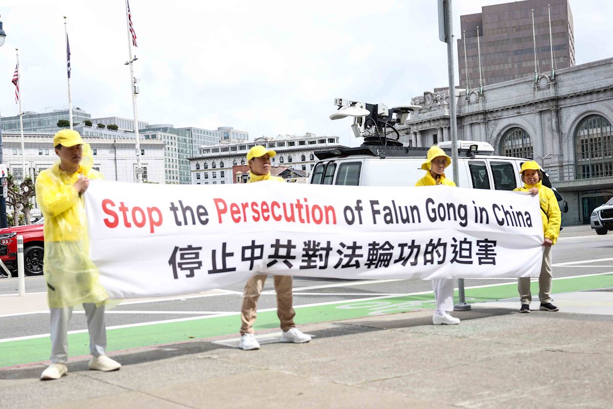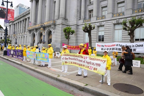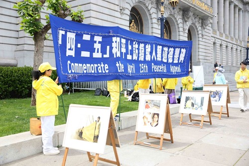 (Minghui.org) 21. April 2026. Mit einer Fotoausstellung erinnerten Falun-Gong-Praktizierende vor dem Rathaus von San Francisco an den friedlichen Appell in Peking vom 25. April 1999.
