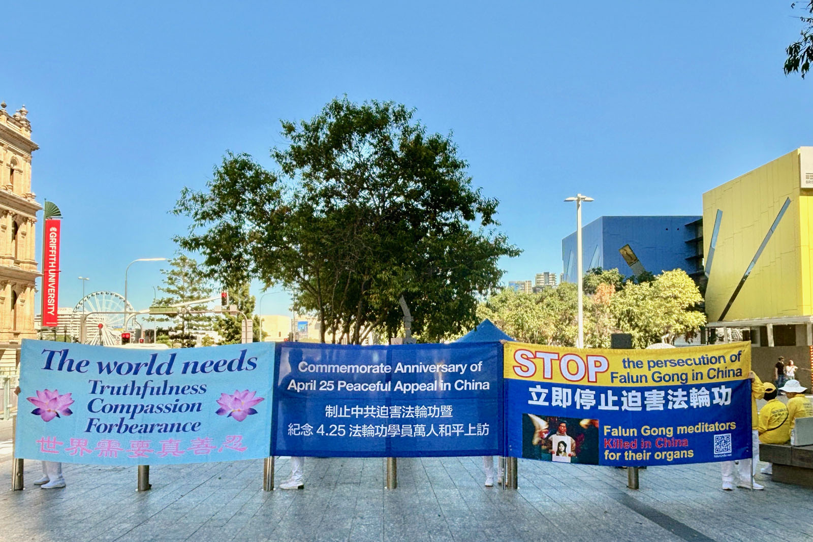 (Minghui.org) Am 18. April 2026 veranstalteten Praktizierende am Brisbane Square eine Kundgebung, um des 27. Jahrestages des Appells vom 25. April in Peking zu gedenken. Sie präsentierten die Falun-Dafa-Übungen, zeigten Transparente und klärten Passanten über die Fakten der Verfolgung von Falun Dafa auf.