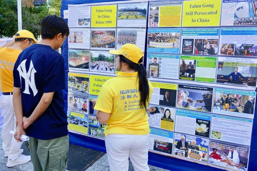 Ein chinesisches Ehepaar blieb stehen und las die Informationstafeln. Sie sprachen mit Praktizierenden und erfuhren, dass die Veranstaltung anlässlich des 27. Jahrestages des Appells vom 25. April abgehalten wurde. An jenem Tag begaben sich 10.000 Falun-Dafa-Praktizierende nach Peking, um der Zentralregierung zu berichten, wie sie vom Praktizieren von Falun Dafa profitiert hatten. Sie forderten: die in Tianjin widerrechtlich inhaftierten Praktizierenden unverzüglich freizulassen; die Veröffentlichung von Falun-Dafa-Büchern gesetzlich zuzulassen und dass Falun-Dafa-Praktizierende die Übungen machen dürfen, ohne belästigt zu werden.