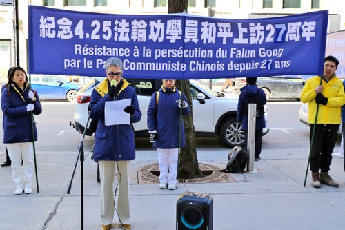 (Minghui.org) Anlässlich des 27. Jahrestages des Appells vom 25. April in Peking veranstalteten Falun-Dafa-Praktizierende am 21. April 2026 eine Kundgebung vor dem chinesischen Konsulat in Montreal. Zwischen wehenden Bannern versammelten sich am 21. April 2026 Falun-Dafa-Praktizierende vor dem chinesischen Konsulat in Montreal, um ein Zeichen zu setzen. Anlass war der 27. Jahrestag des historischen Appells vom 25. April in Peking. Mit einer Kundgebung erinnerten sie an dieses Ereignis und machten zugleich auf die anhaltende Verfolgung durch die Kommunistische Partei Chinas (KPCh) aufmerksam. Darüber hinaus richteten sie einen eindringlichen Appell an die kanadische Regierung, Maßnahmen gegen die grenzüberschreitende Repression der KPCh zu ergreifen.