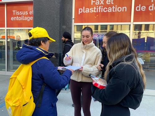 Mia, eine Studentin, und ihre Freundin unterzeichneten die Petition. Mia sagte: „Ich finde diesen friedlichen Protest wirklich berührend. Alle standen ruhig da, hielten Transparente und verteilten Flugblätter und informierten uns über die Verfolgung. Ihr habt eure Botschaft auf eine Weise vermittelt, die echten Respekt verdient. Ich hoffe sehr, dass noch mehr Menschen auf dieses Thema aufmerksam werden und die Petition unterzeichnen, um euch zu unterstützen.“