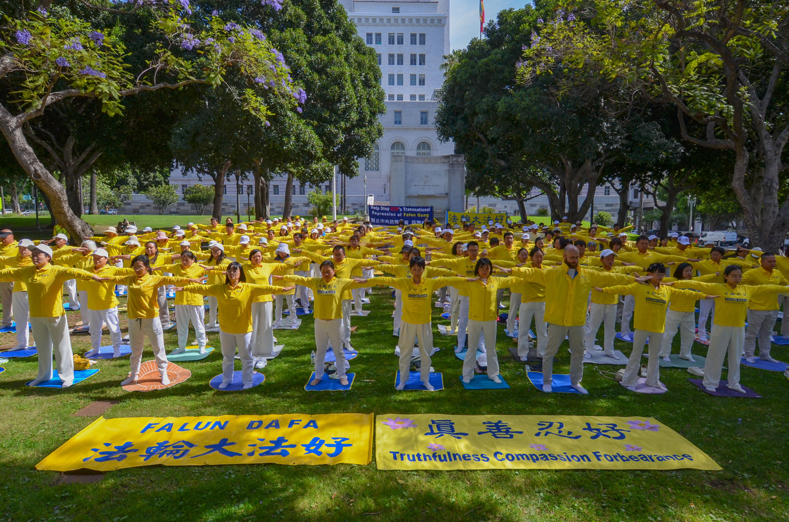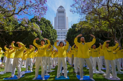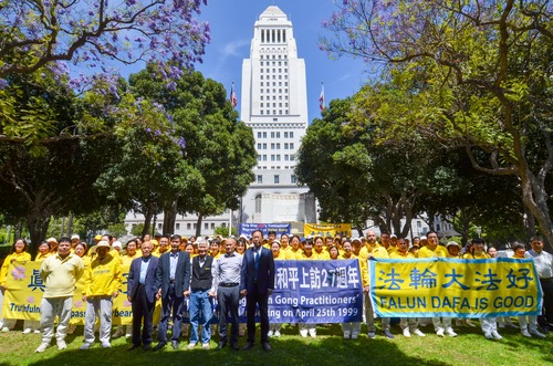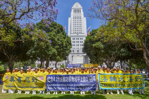 (Minghui.org) Vor der Los Angeles City Hall versammelten sich am 23. April 2026 Falun-Dafa-Praktizierende, um an den 27. Jahrestag des Appells vom 25. April in Peking zu erinnern. Mit ihrer Kundgebung riefen sie die Öffentlichkeit dazu auf, dazu beizutragen, die seit nunmehr 27 Jahren andauernde Verfolgung dieser friedlichen Kultivierungspraxis für Körper und Geist durch die Kommunistische Partei Chinas (KPCh) zu beenden.