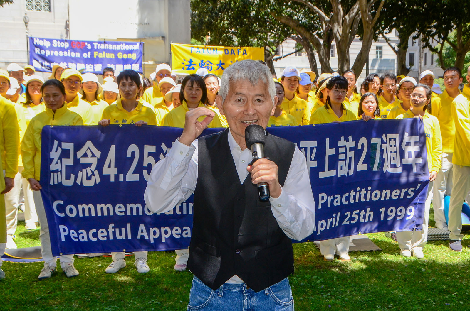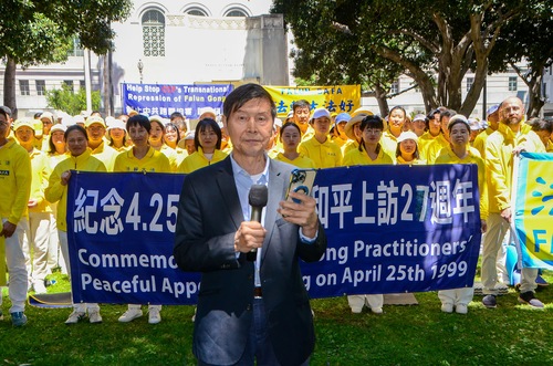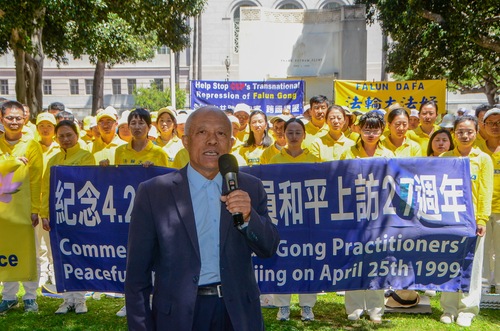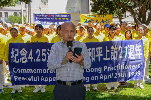 Professor Wu Yingnian, Sprecher des Falun Dafa Vereins Los Angeles, erläuterte kurz den Hintergrund des Appells vom 25. April in Peking. Er berichtete, dass die Praktizierenden nach Peking gereist seien, um die Freilassung von mehr als 40 Mitpraktizierenden zu fordern, die in Tianjin – einer Stadt 96 Kilometer östlich von Peking – verhaftet worden waren.