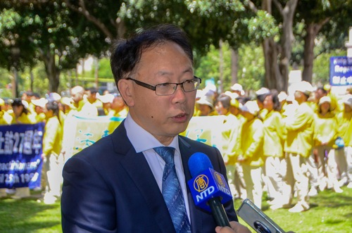Dr. Li Youfu, Vorsitzender des Falun Dafa Vereins Südwest, spricht auf der Kundgebung (Screenshot mit freundlicher Genehmigung von The Epoch Times)