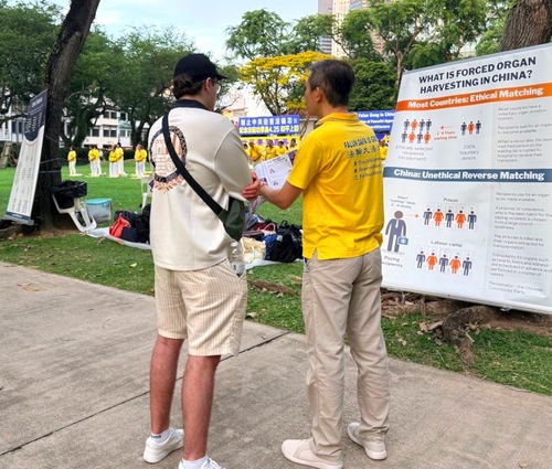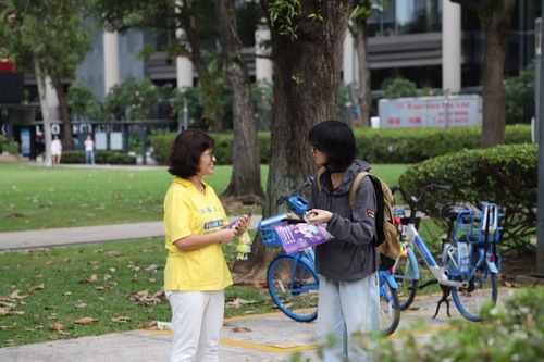 Ein junger Mann aus China, der Singapur besuchte, erzählte, er spüre dort die Atmosphäre der Freiheit, und hörte der Erklärung des Praktizierenden aufmerksam zu. Der Praktizierende erklärte ihm, dass die Unterdrückung der Falun-Dafa-Praktizierenden durch die KPCh zugleich eine Verfolgung aller Chinesen darstelle und dass die Unterdrückung von Güte zu moralischem Verfall und dem Zusammenbruch der Rechtsstaatlichkeit führe. Folglich trügen alle die Konsequenzen. Der junge Mann sagte zu dem Praktizierenden: „Ich verstehe alles, was Sie gesagt haben.“
