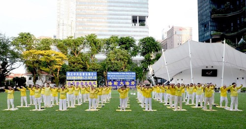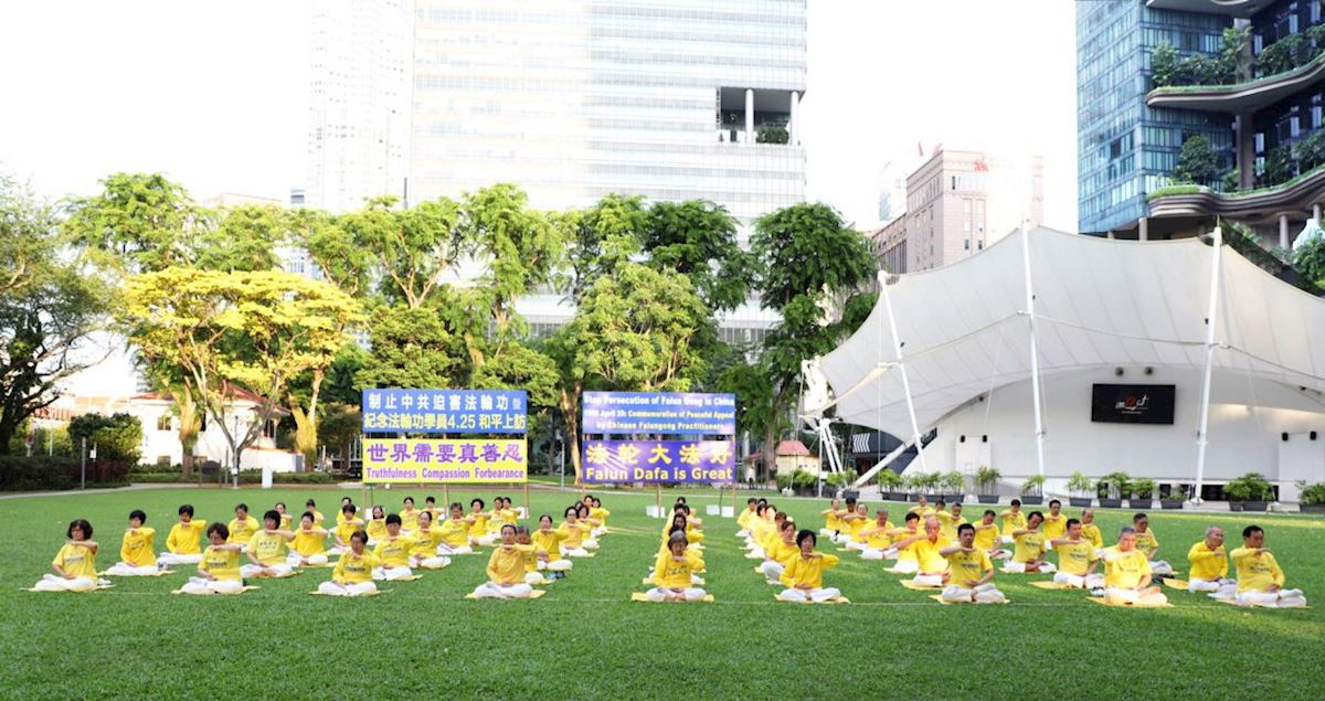Praktizierende führen am 16. April 2026 im Hong Lim Park die Falun-Dafa-Übungen durch, um den 27. Jahrestag des Appells vom 25. April in Peking zu begehen
