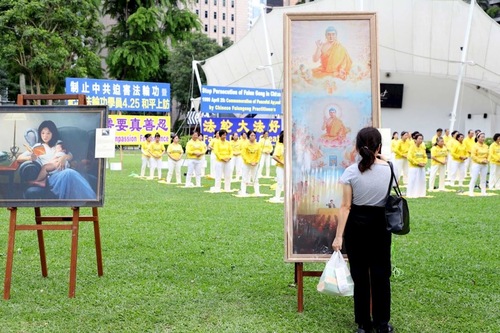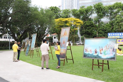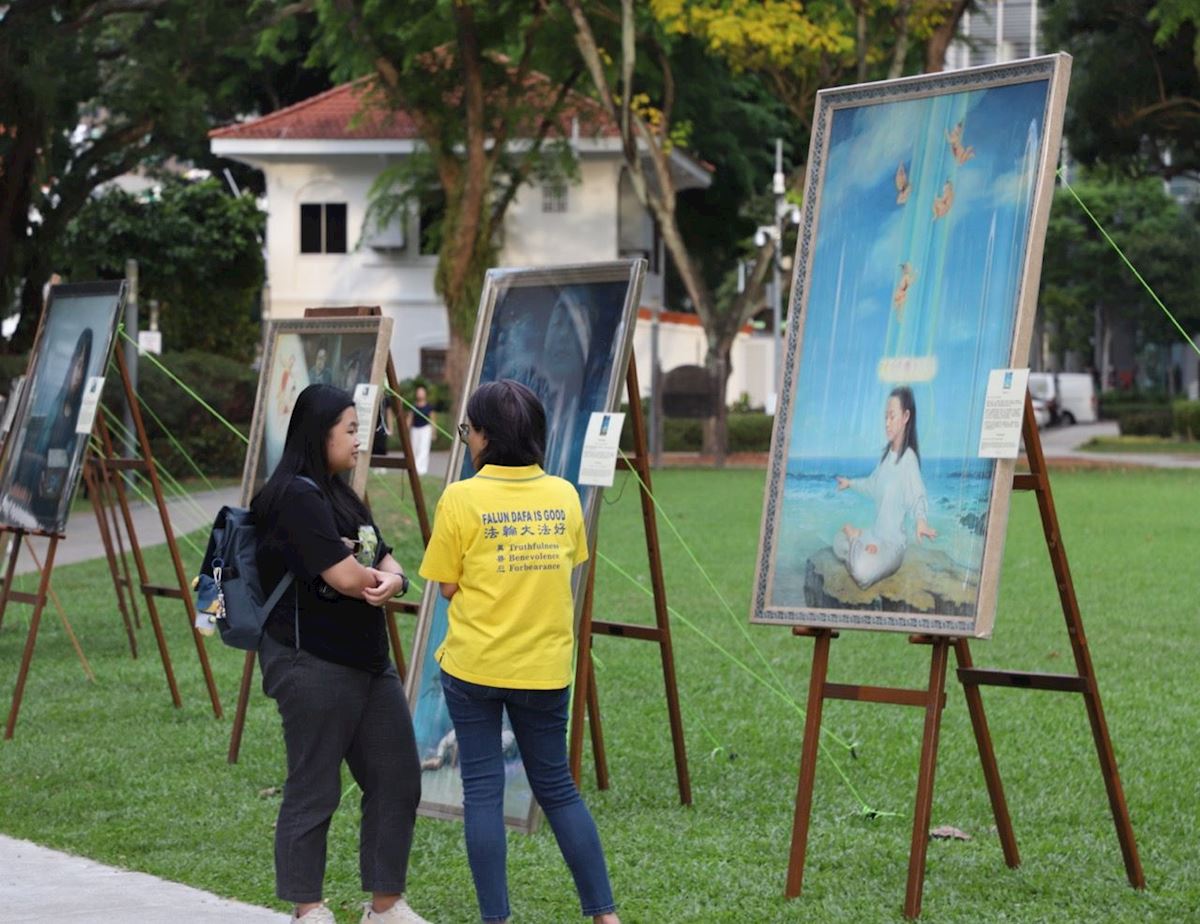 Die Parkbesucher blieben stehen und betrachteten die Gemälde der Ausstellung „Die Kunst von Zhen Shan Ren“, die im Rahmen der Veranstaltung gezeigt wurde. Sie unterhielten sich mit Praktizierenden, dachten über die tiefere Bedeutung der Kunstwerke nach und erfuhren mehr über die Verfolgung des Glaubens durch die KPCh. Einige merkten an, dass die Gemälde eine besondere Energie ausstrahlen würden. Andere wiederum brachten ihre Bestürzung zum Ausdruck, als sie von der Verfolgung hörten. Jeremy, ein Singapurer um die 30, zeigte großes Interesse an dem Gemälde „Erläuterung des Fa“. Eine Praktizierende erzählte ihm von Falun Dafa und lud ihn ein, an einem kostenlosen neuntägigen Kurs teilzunehmen. Danach berichtete sie ihm von der brutalen Verfolgung in China.