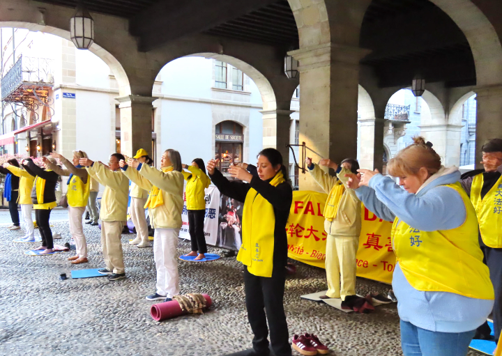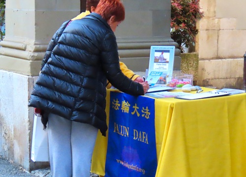 Der Sitz des Großen Rates von Genf ist eine bekannte Touristenattraktion. Daher sahen viele Besucher den Praktizierenden bei ihren Übungen zu und nahmen die ausgelegten Informationen mit. Zahlreiche Besucher unterstützten die Praktizierenden mit ihrer Unterschrift unter die Petition, die ein Ende der Verfolgung fordert.