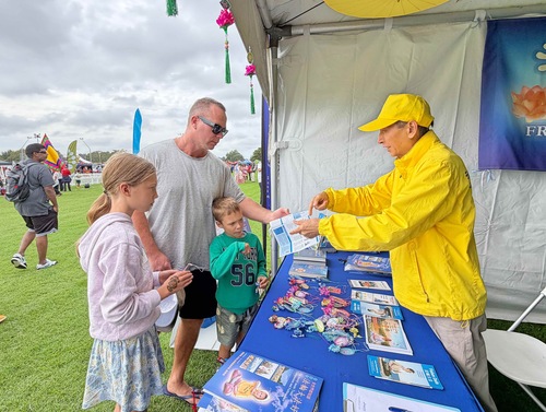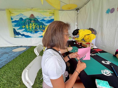 Dafa-Künstler stellten verschiedene Aspekte der traditionellen chinesischen Kultur vor, darunter Scherenschnitt, Kalligrafie und Teeverkostung. Viele Festivalbesucher verweilten an ihrem Stand und einige äußerten ihre Bewunderung für die Ruhe, Geduld und Güte der Künstler.