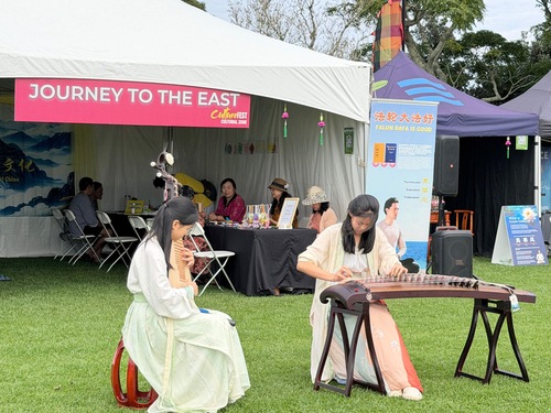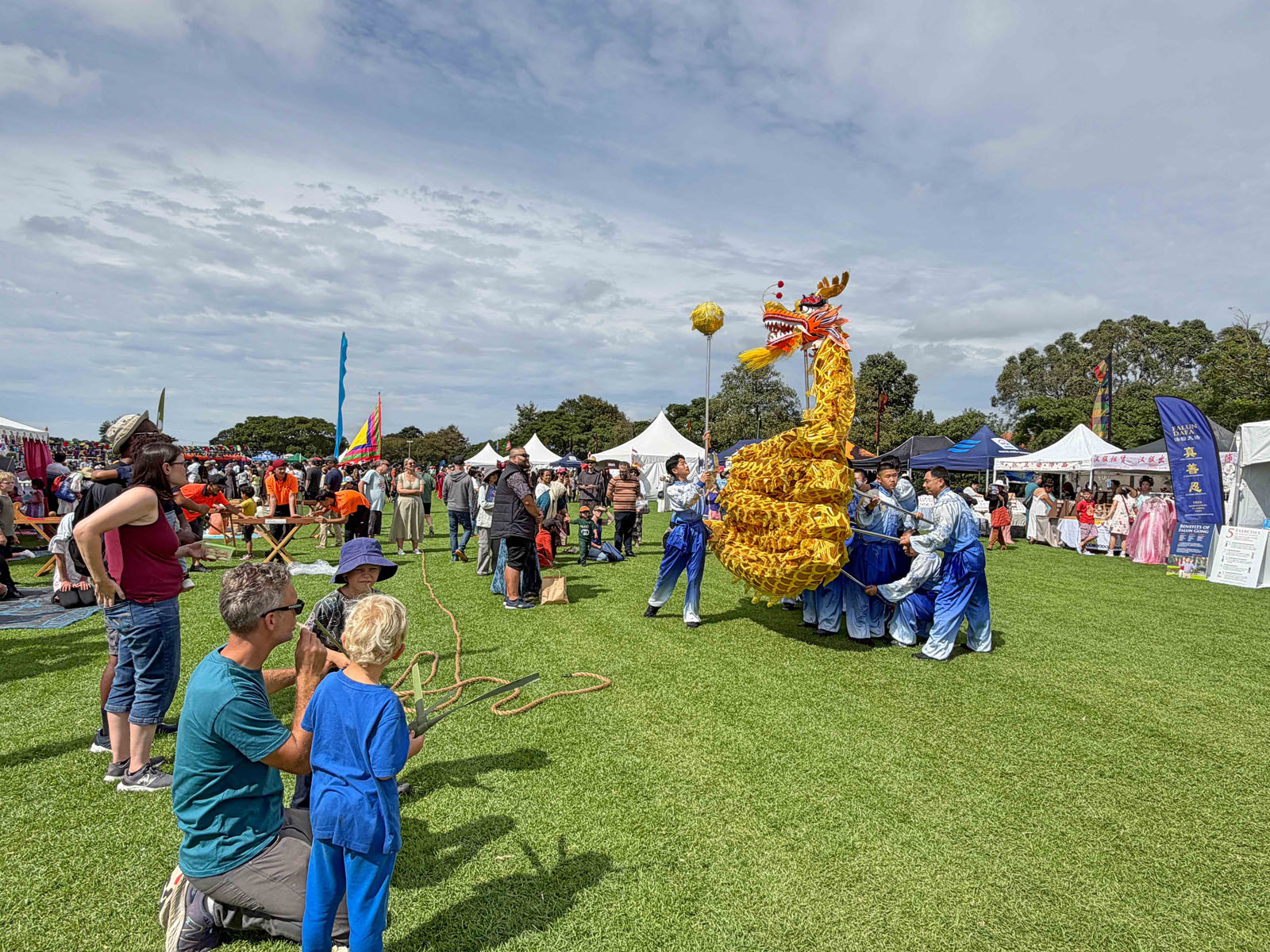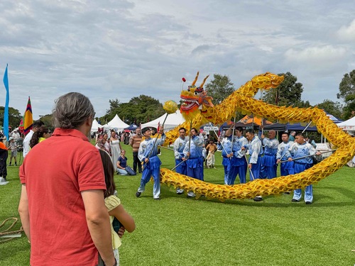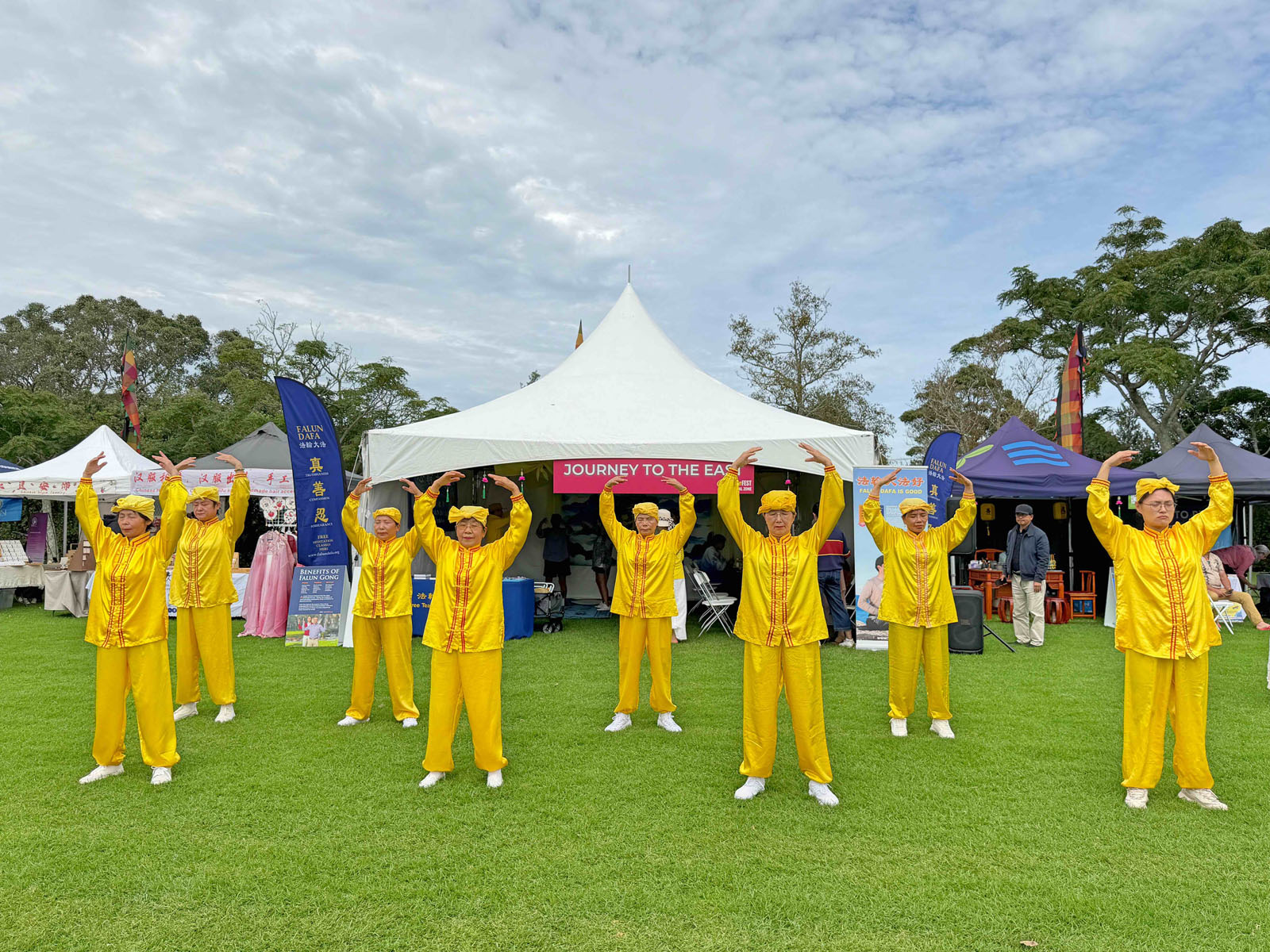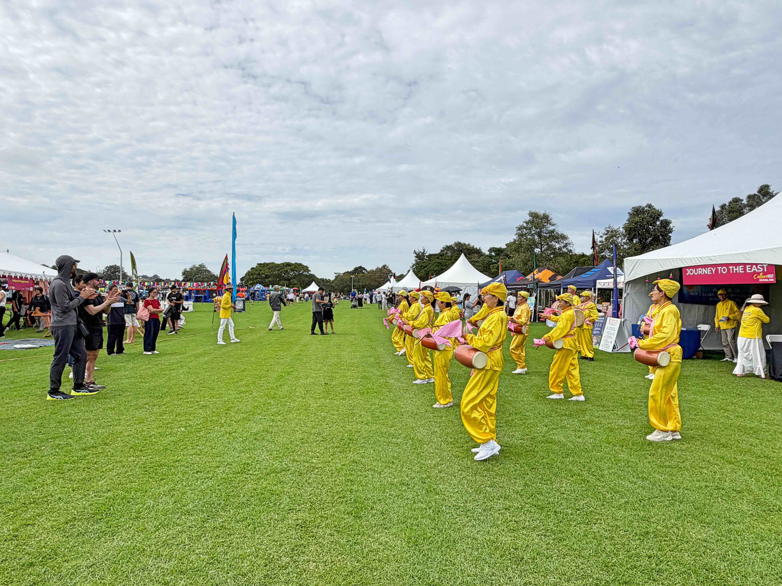 (Minghui.org) Falun-Dafa-Praktizierende nahmen am 29. März 2026 am Kulturfest 2026 in Auckland, Neuseeland, teil. An ihrem Stand stellten sie Falun Dafa vor und führten die Falun-Dafa-Übungen vor. Viele Besucher blieben stehen und schauten zu, manche probierten die Übungen sogar selbst aus. Die Praktizierenden spielten außerdem auf Hüfttrommeln, führten einen lebhaften Drachentanz auf und spielten Guzheng und Pipa, traditionelle chinesische Musikinstrumente. Viele Festivalbesucher fanden, dass die Praktizierenden eine echte Bereicherung für das Fest waren.